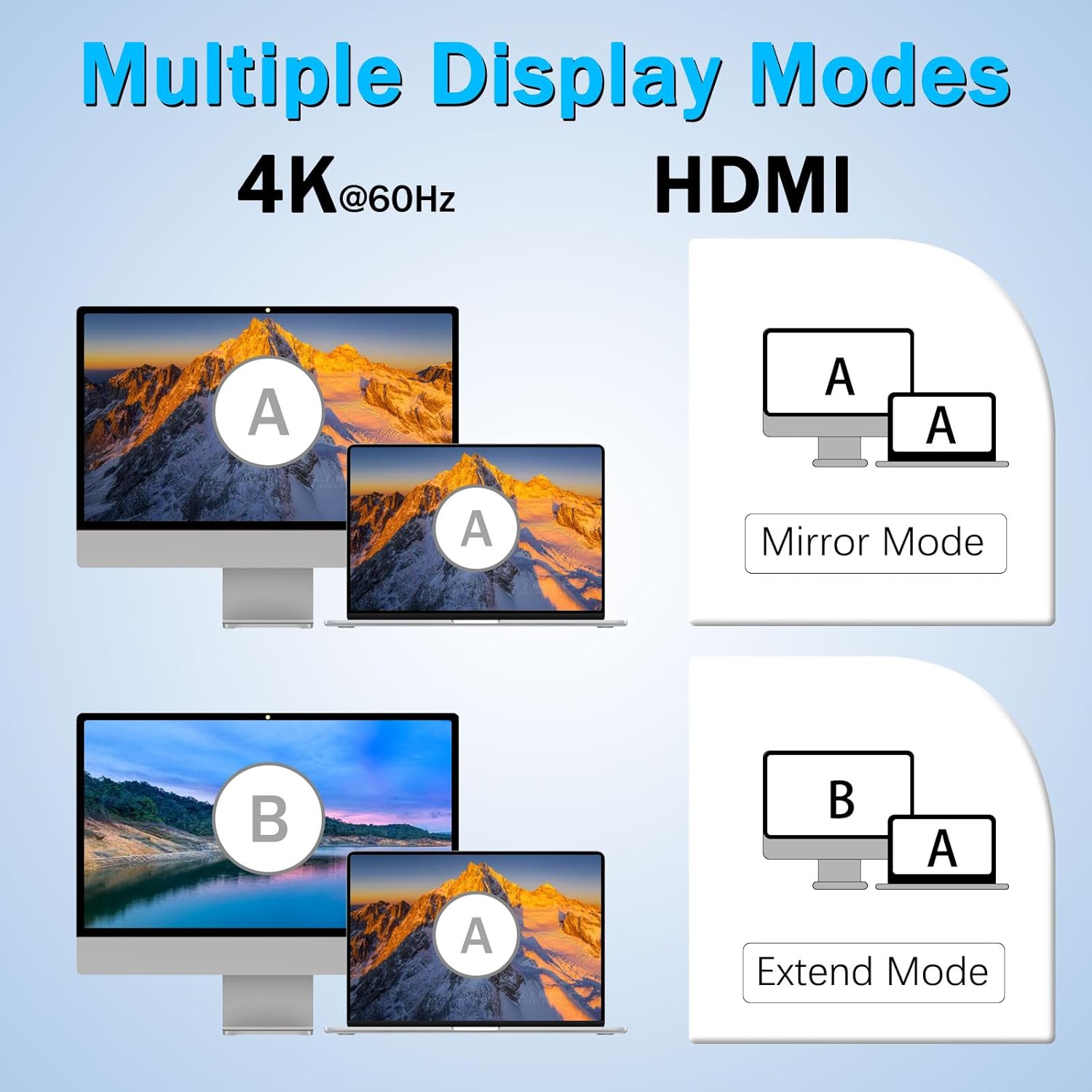 4K 60Hz एचडीएमआई स्प्लिटर के साथ 4-इन-1 यूएसबी-सी हब यूएसबी-सी पोर्ट से लैस कई आधुनिक उपकरणों के साथ संगत है जो वीडियो आउटपुट का समर्थन करते हैं।
