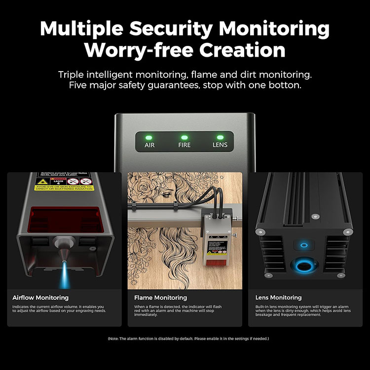 · ❤【कक्षा 1 प्रमाणित और कई सुरक्षा सुरक्षा】-लकड़ी और धातु के लिए क्रिएलिटी फाल्कन2 प्रो 40W लेजर एनग्रेवर एक फ्लेम डिटेक्टर, डुअल वायर लिमिट स्विच, सेफ्टी लॉक, इमरजेंसी स्टॉप बटन और लेजर डिटेक्शन कवर पांच सुरक्षा सुविधाओं से लैस है। इसके अलावा, निर्माण प्रक्रिया के दौरान धुएं, धूल और शोर को अलग करने के लिए पारदर्शी डिजाइन, एक पूर्ण धातु फ्रेम, पूरी तरह से संलग्न संरचना, अग्निरोधक फाइबर कवर से ढका हुआ, जिससे आप अपने काम के प्रति समर्पित हो सकते हैं!