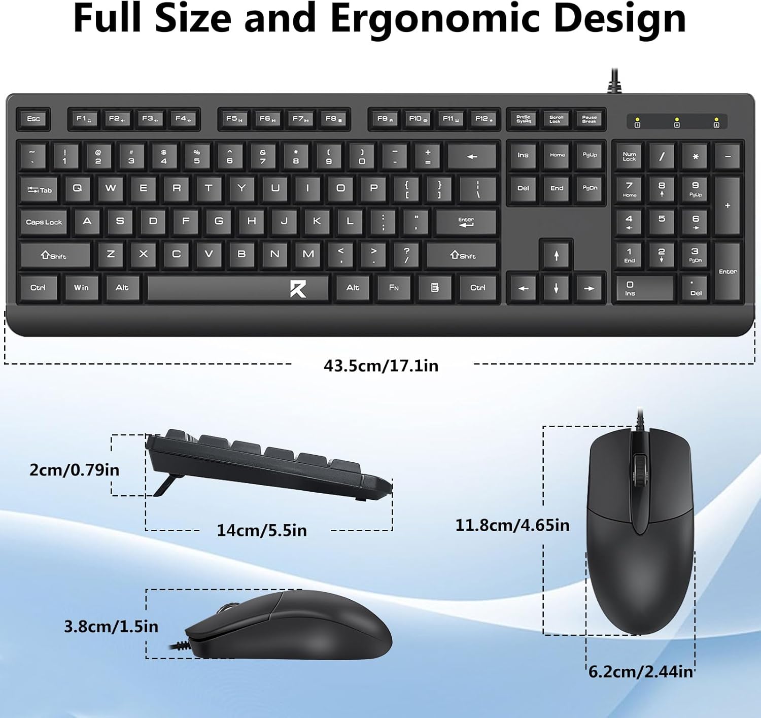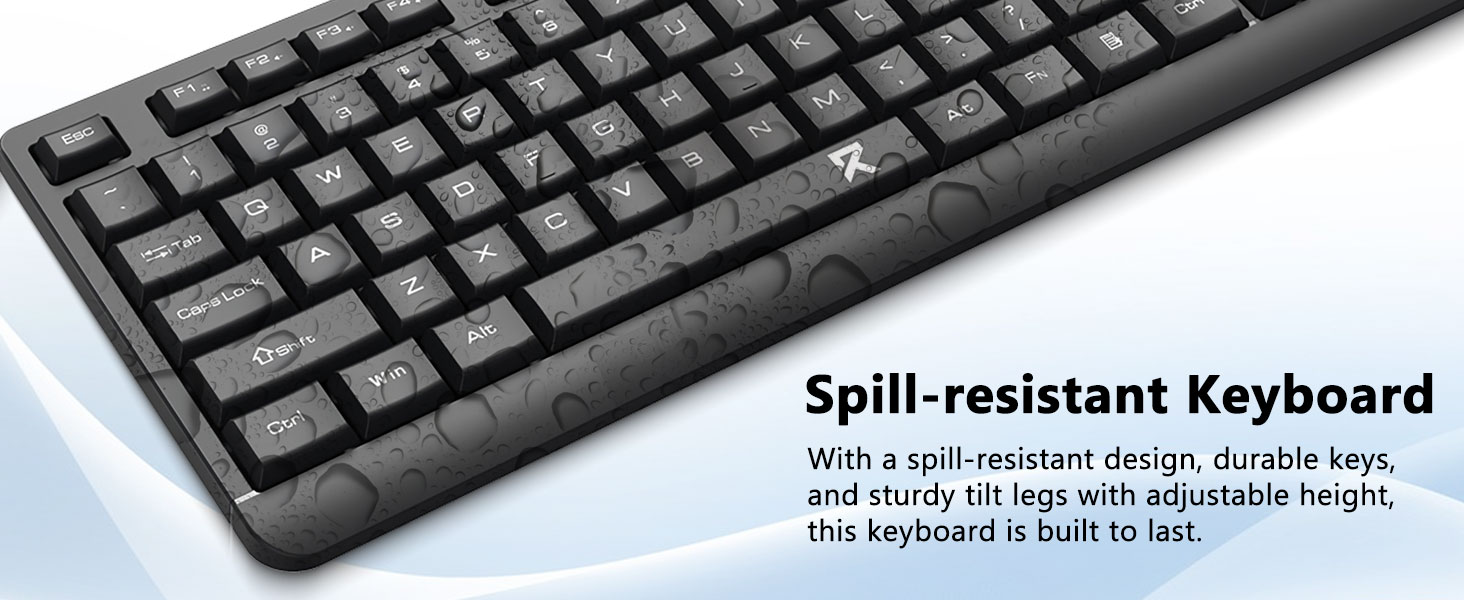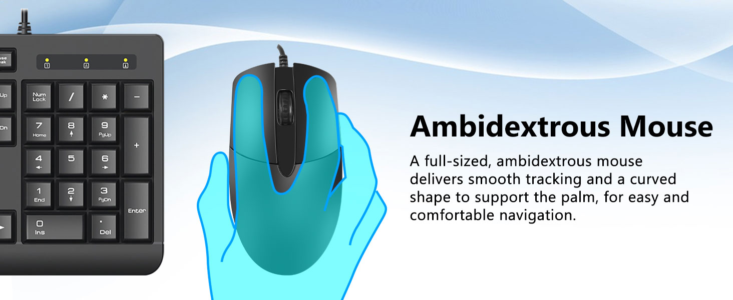 पूर्ण आकार के कीबोर्ड लेआउट में एक संख्यात्मक कीपैड, मल्टीमीडिया कुंजियाँ और कुंजियों के बीच आरामदायक रिक्ति शामिल है। साथ में दिया गया माउस विभिन्न सतहों पर सटीक ट्रैकिंग और सुचारू कर्सर मूवमेंट के लिए डिज़ाइन किया गया है।