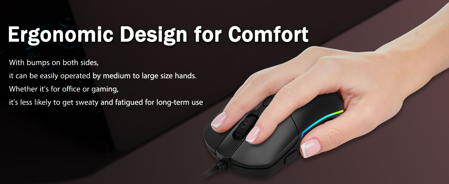 आरामदायक पकड़- दोनों तरफ एर्गोनोमिक बम्प गेमिंग चूहों को किसी भी हाथ में फिट बनाता है। यह गहन गेमप्ले के लंबे घंटों के दौरान भी खिलाड़ियों को बिना थकान के लंबे समय तक आराम प्रदान करता है। गेमिंग माउस उठाते समय, या तेज़ और सटीक स्वाइप करते समय यह फिसलेगा नहीं।