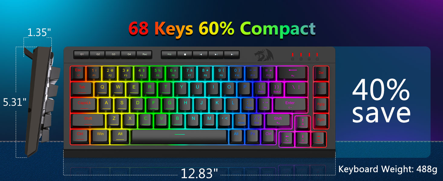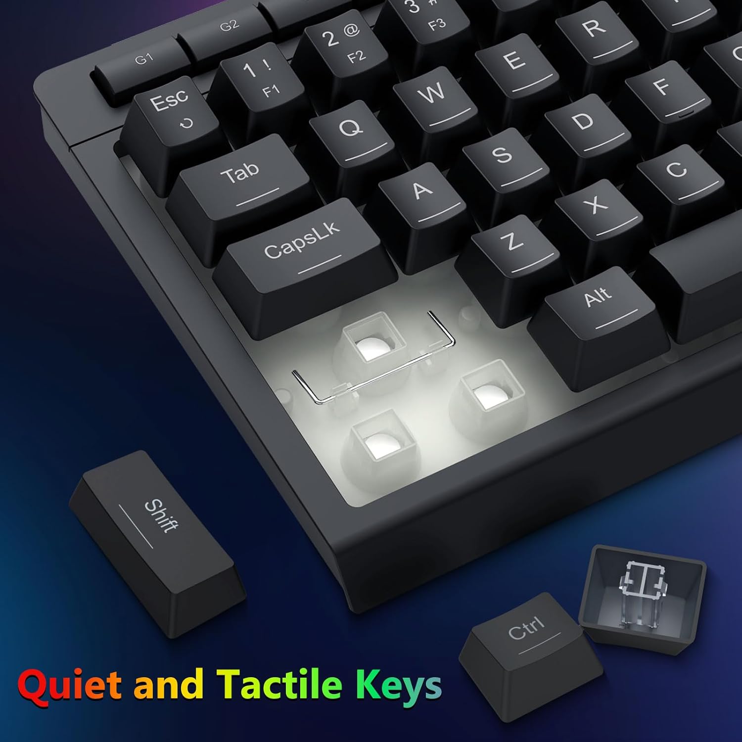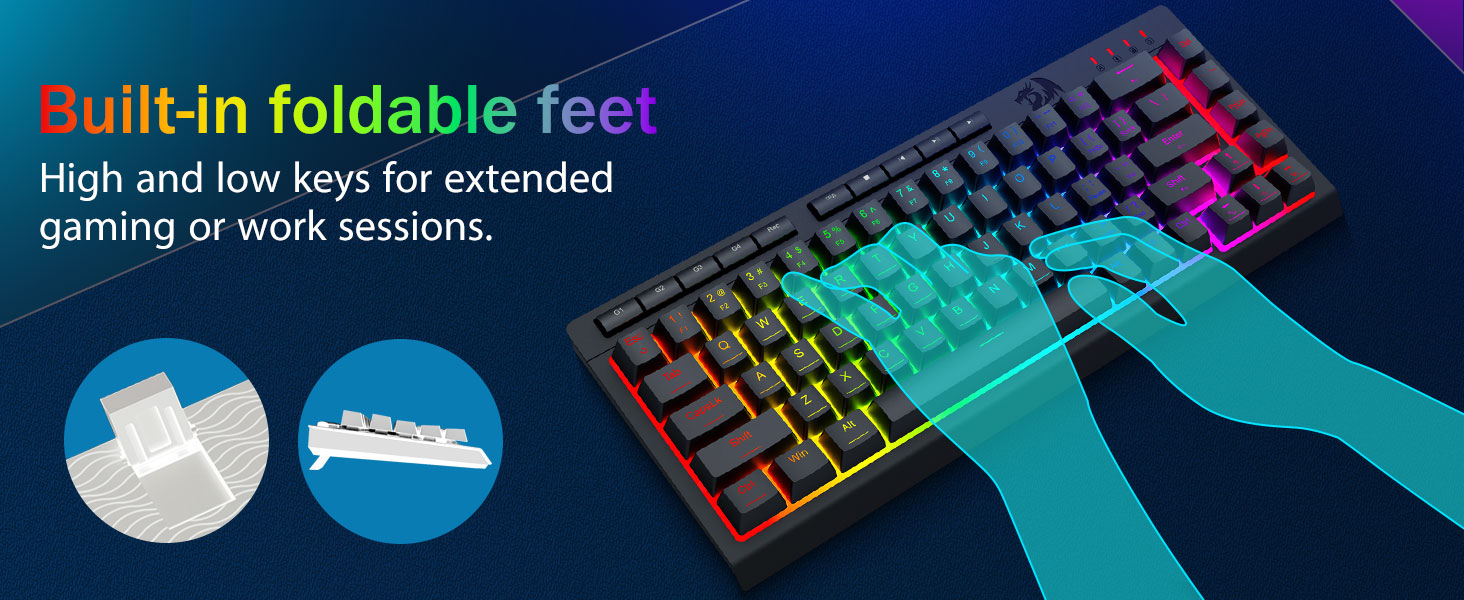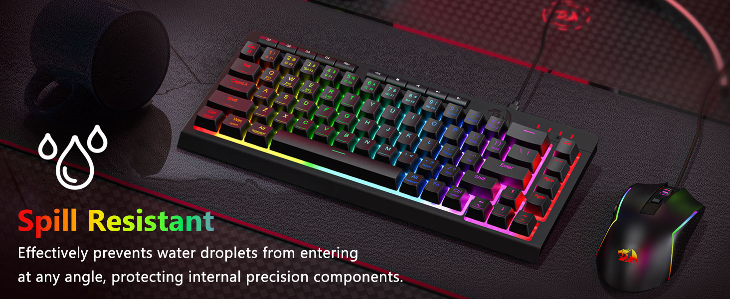 कीकैप्स को स्थायित्व और सुसंगत बनावट के लिए डिज़ाइन किया गया है, जो लंबे समय तक आराम बनाए रखने में मदद करता है। आरजीबी प्रकाश समान रूप से वितरित किया जाता है, जिससे विकर्षण के बिना दृश्यता में सुधार होता है।