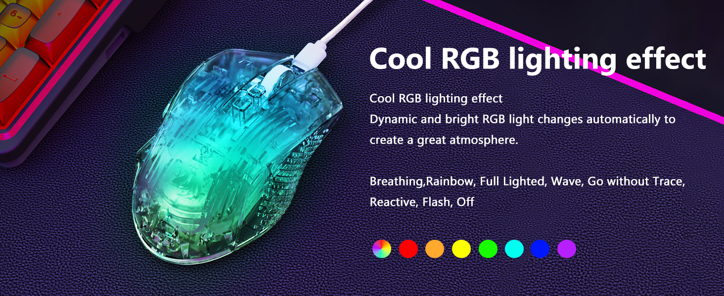 माउस में आठ आरजीबी प्रकाश प्रभाव शामिल हैं जो प्रदर्शन को प्रभावित किए बिना दृश्य अपील को बढ़ाते हैं। उपयोगकर्ता अपने सेटअप या व्यक्तिगत पसंद से मेल खाने के लिए प्रकाश मोड के बीच स्विच कर सकते हैं।