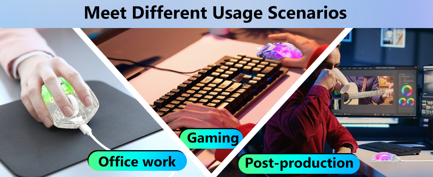 गेमिंग से परे, माउस कार्यालय वातावरण में अच्छा प्रदर्शन करता है, दस्तावेज़ संपादन, ब्राउज़िंग और डेटा प्रबंधन जैसे कार्यों का समर्थन करता है।